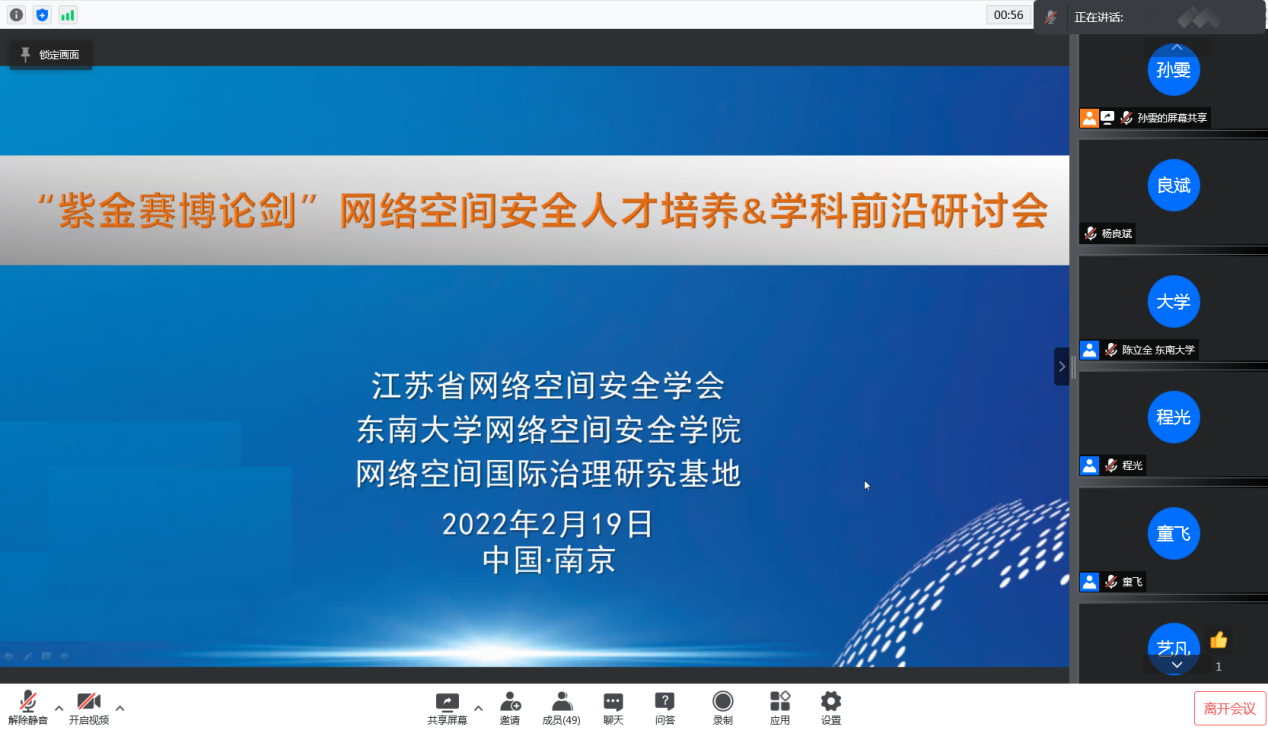 2月19日,为庆祝东南大学建校120周年,“紫金赛博论剑”网络空间安全人才培养&学科前沿研讨会通过在线方式顺利举行,该会议由江苏省网络空间安全学会主办,东南大学网络空间安全学院承办,网络空间国际治理研究基地协办。会议由东南大学副校长金石教授代表主办方致辞。22名网络安全知名学者受邀作主旨演讲,参会者多达300余名。