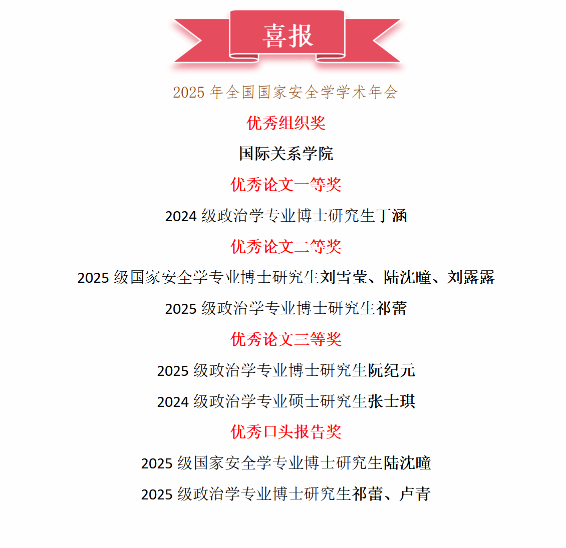 2025年12月13日至14日,由国务院学位委员会国家安全学学科评议组主办、北京师范大学承办的2025年全国国家安全学学术年会在北京师范大学珠海校区召开。我院研究生处处长杨华锋、公共管理系教授李文良、研究生处副处长徐青,以及硕博研究生代表参加会议。