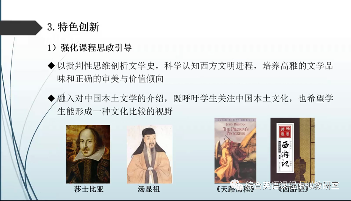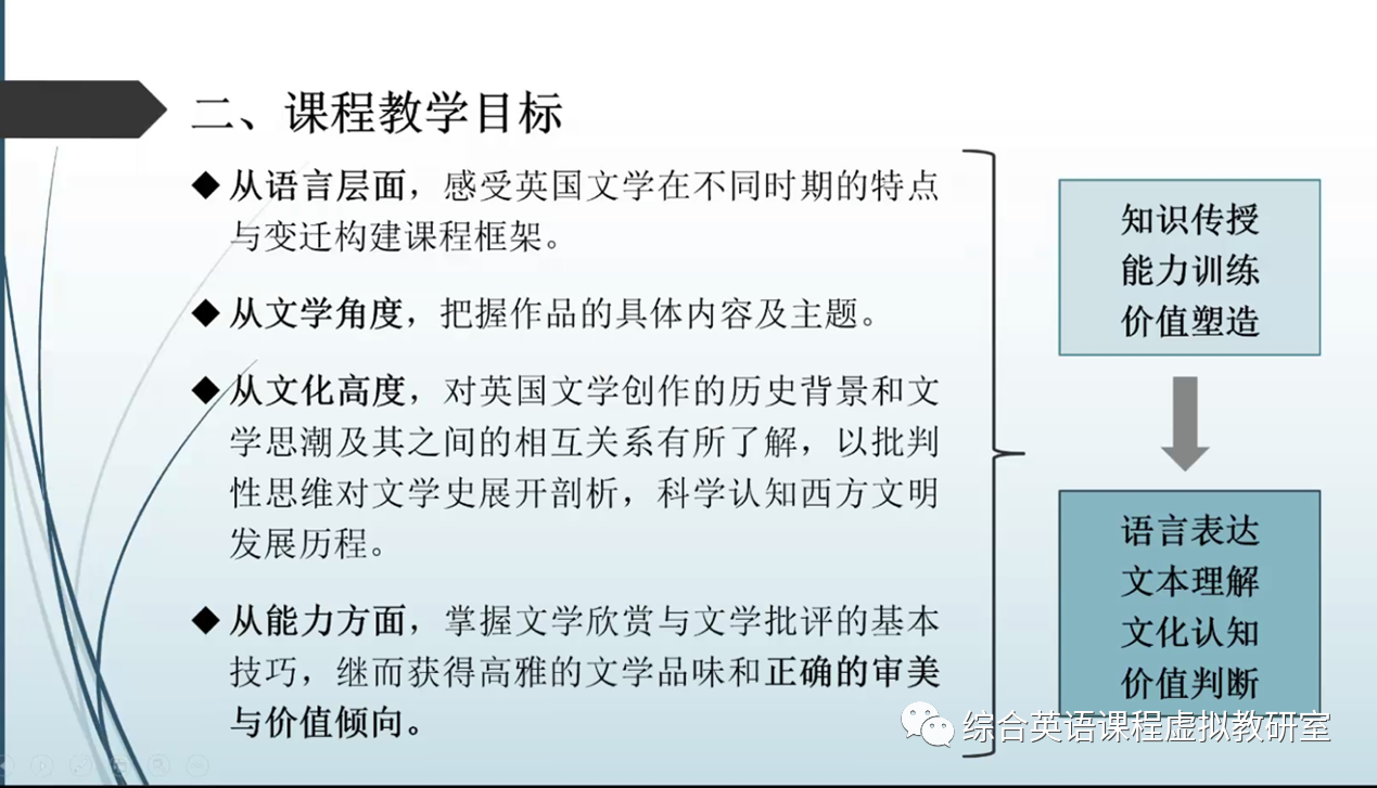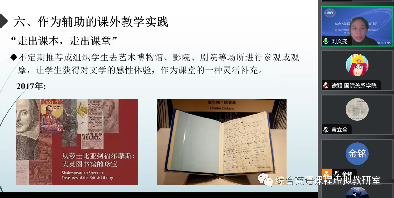 刘文尧老师首先介绍了课程的发展沿革和教学目标。自接手课程起,她在七年时间里不断完善教学内容,改进教学方法,持续补充学术前沿和当下文学热点;该课程旨在让学生从语言、文学、文化三个层面增进学生对英国文学的认知,提升学生的审美能力和价值判断力。