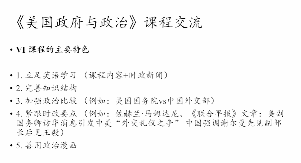 随后,张国帅老师系统介绍了该课程的建设历程。《美国政府与政治》作为面向英语专业学生的专业选修课,源自曾获评“北京高等学校优质本科课程”、面向国际政治系开设的同名双语课程。在当今国际环境日趋复杂、西方话语体系仍占据主导地位的背景下,中国亟需培养一批既通晓国际规则、又能熟练运用英语讲述中国故事的复合型人才。为此,高校英语教学必须实现从“工具性”向“人文性”与“思想性”拓展,从“语言教学”向“价值引领”深化,使学生未来能更好地适应国家对外交往与国际沟通的需要,在跨文化语境中切实服务国家发展大局。