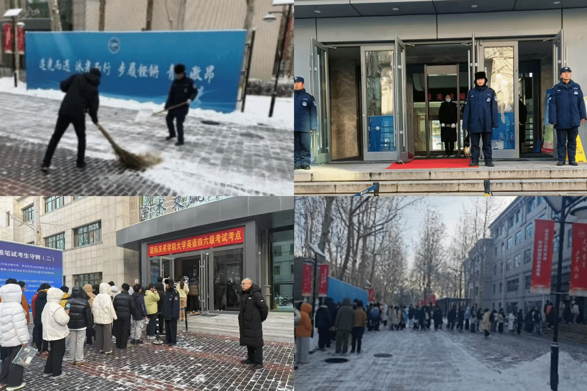 本次四、六级考试适逢北京遭遇冰雪严寒天气,学校各部门克服困难,积极采取措施为考试、考生服务。所有考务人员按时到岗,严守考场纪律,确保试卷分发、回收等环节零误差。本次考试继续使用智能安检门与手持金属探测器双层安检体系,考生安检现场调度有序,考生分批次、分通道快速高效入场。