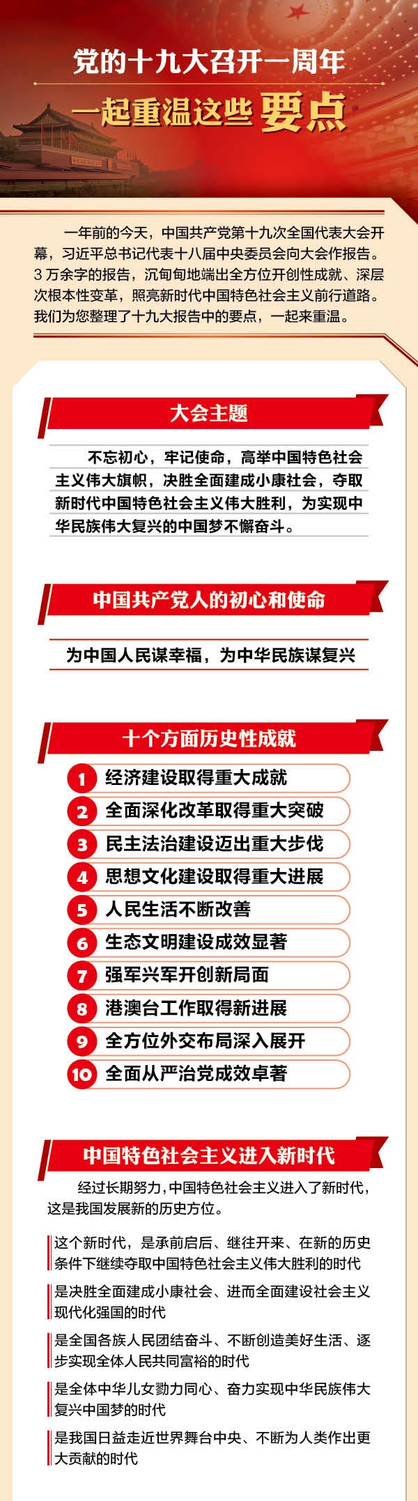 一年前的金秋,党的十九大明确了实现第一个百年目标的重点,也对实现第二个百年目标进行了战略谋划。 一年来,在以习近平同志为核心的党中央引领下,一个致力高质量发展、凝聚起磅礴伟力的发展中大国,昂首阔步...